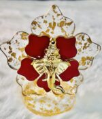 The Resin Lotus Ganpati Standee is a beautifully handcrafted piece that combines devotion, elegance, and artistry. Made with high-quality resin, it features Lord Ganesha in a radiant golden finish, seated gracefully on a lotus-inspired backdrop with deep red petals and shimmering gold flakes.